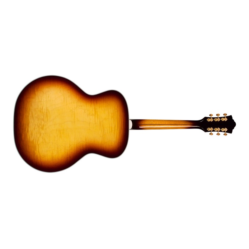 La jumbo Guild definitiva è qui: F-55E Maple ATB made in USA, presenta un top in abete rosso Sitka massello selezionato con fondo in acero fiammato arcuato ( Arched) e fasce in acero fiammato. Prodotta sulla pressa ad arco presente nella fabbrica Guild dal 1985, F-55E Maple ATB offre alti definiti e brillanti ed un mid-range articolato perfetto per un suono stile arpa molto apprezzato dai musicisti. L'acero, per la sue caratteristiche, riesce distinguersi dalle altre essenze per l'ottimo controllo delle frequenze medio basse e una spiccata personalità sulle frequenze alte. Le eleganti rifiniture comprendonoi classici inlay Guild “V-block” su una tastiera in Ebano, il manico in mogano con profilo C in tre pezzi con rinforzo centrale in noce (Walnut) il nut in osso è di 43 mm , la scale dello strumento e di 651 mm ,i binding e i purfling sono in ABS, hardware dorato, le meccaniche Gotoh SE700 aperte dorate completano la dotazione, una bellissima finitura lacquer in nitrocellulosa lucida Antique Sunburst e l'eccellente qualità costruttiva rendono questo strumento una delle più interessanti jumbo di casa Guild.Il sistema di amplifcazione è L.R. Baggs Anthem.La chitarra è corredata da un custodia rigida in legno Guild con un sistema di umidificazione Humicase®