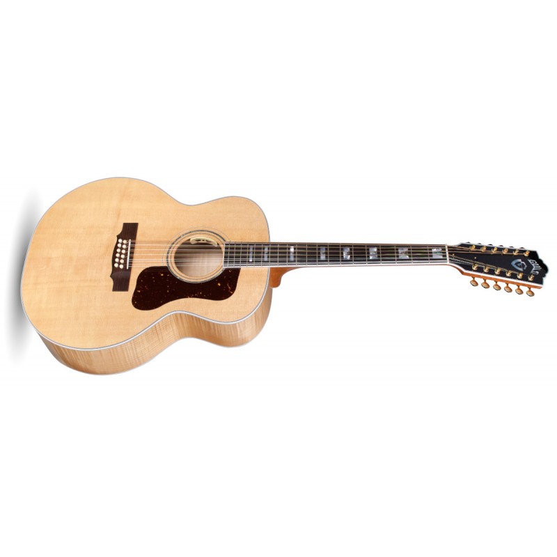 'Notoriamente utilizzata da Tom Petty, David Gilmour e Stevie Ray Vaughan, la F-512E ha definito il suono della chitarra 12-corde negli anni '60, queste iconiche chitarre continuano ad essere le favorite tra le 12-corde oggi presenti sul mercato. La F-512E made in USA realizzata in Southern California, prosegue questa tradizione con un top in abete rosso AAA Sitka massello, fondo e fasce sono in palissandro indiano massello. l'incatenatura è in abete Adirondack intonata a mano, il manico con profilo C ha un rinforzo centrale in Walnut, la scala della chitarra è di 651 mm, il nut (48mm) e il traversino sono in osso.. Questo modello produce alti brillanti, medi definiti e una risposta sulle frequenze basse calda e corposa che la rendono unica e riconoscibile. La tastiera in ebano come il ponte è decorata con i classici inlay Guild MOP V-block,le meccaniche sono le Gotoh SE701 dorate .Vi sembrerà di imbracciare un pezzo di storia con la vostra F-512E, la finitura è in Nitrocellulosa lucida Natural, La chitarra è corredata da un custodia rigida in legno Guild con un sistema di umidificazione Humicase®.Il sistema di amplifcazione è L.R. Baggs Anthem.'