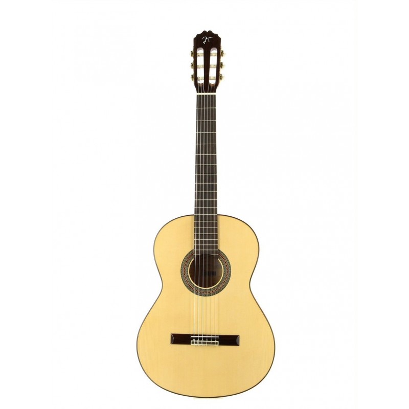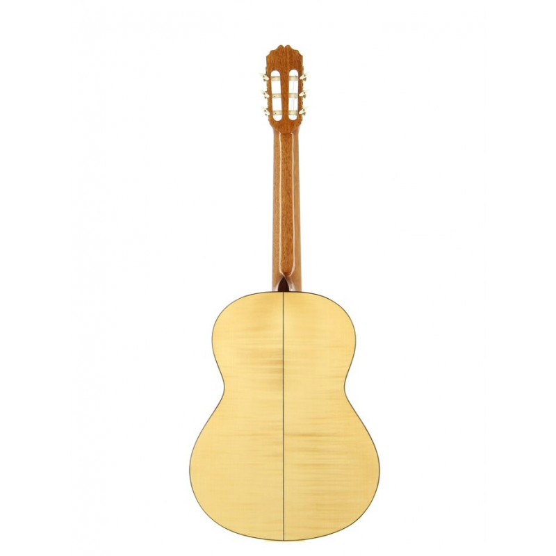 Chitarra flamenca. Top solido in abete. Fasce e fondo in sicomoro Manico in mogano. Tastiera in palissandro indiano. Capotasto in osso. Meccaniche dorata. Binding in palissandro indi