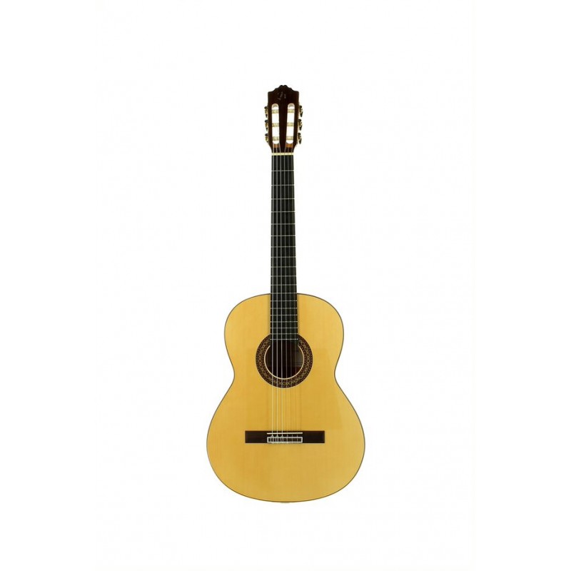 Chitarra flamenca Made in Spain. Top solido in abete. Fasce e fondo in sicomoro. Manico in cedro. Tastiera in ebano. Ponte in palissandro. Meccaniche dorata. Finitura lucida.