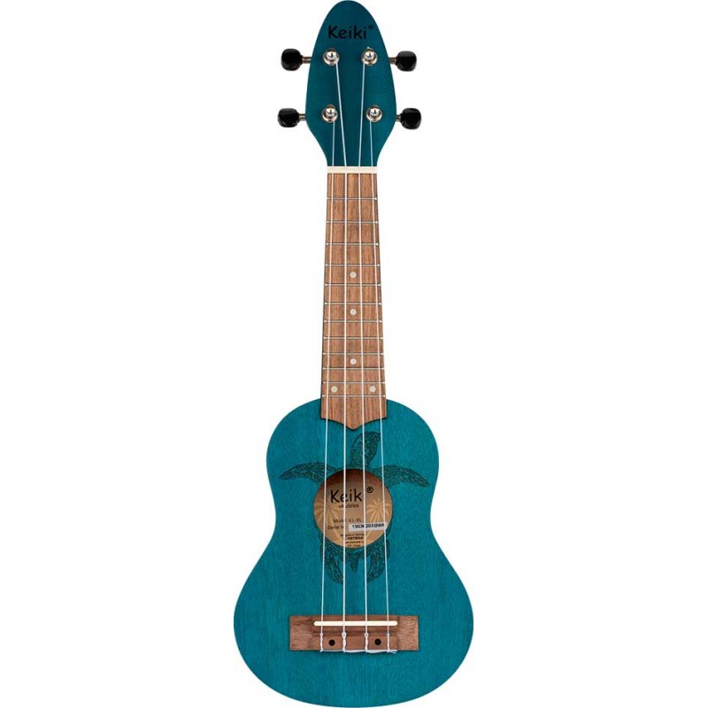 Ukulele Sopranino Keiki K1-MM. (più piccolo del soprano, scala 248mm). Finitura in azzurro satinato. Corpo e manico in okume, tastiera e ponte in nogal. Top in okume con incisione a laser di una tartaruga. Meccaniche...