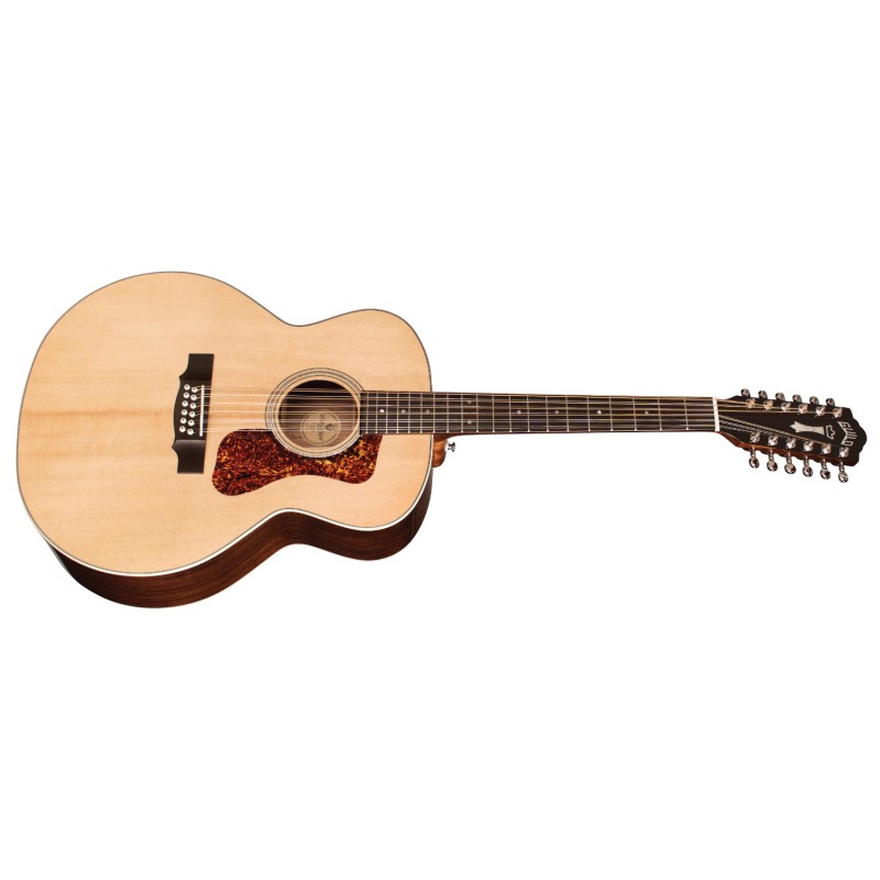 La F-1512- combina due delle più iconiche specialità Guild: 12 corde e corpo jumbo. Con il loro corpo largo e arrotondato le chitarre acustiche jumbo sono state la specialità Guild fin dal 1954 combinando questa forma con la popolare costruzione 12-corde la Guild riesce a sprigionare un suono pieno e ricco di armoniche. Costruita con top in abete rosso Sitka massello e fondo e fasce in palissandro indiano massello ha un manico in mogano Profilo C, la tastiera e ponte sono in palissandro. La F-1512E ha il nut (capotasto) da 48 mm e traversino ( Saddle) in osso, la rosetta in madreperla, l'iconica paletta Chesterfield con emblema delle Guild dei '60.Il battipenna in stile d'epoca è in celluloide tartarugata, il nuovo case Guild leggero in polyfoam. Disponibile in finitura poliuretanica natural gloss ( lucida).embalaje mal estadoArtículo reembalado