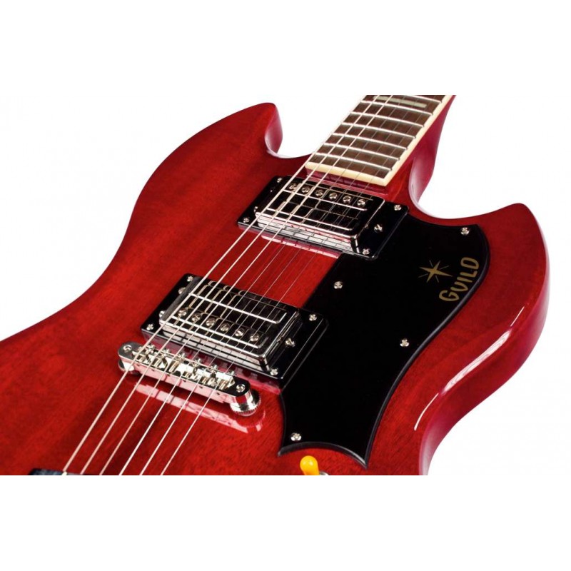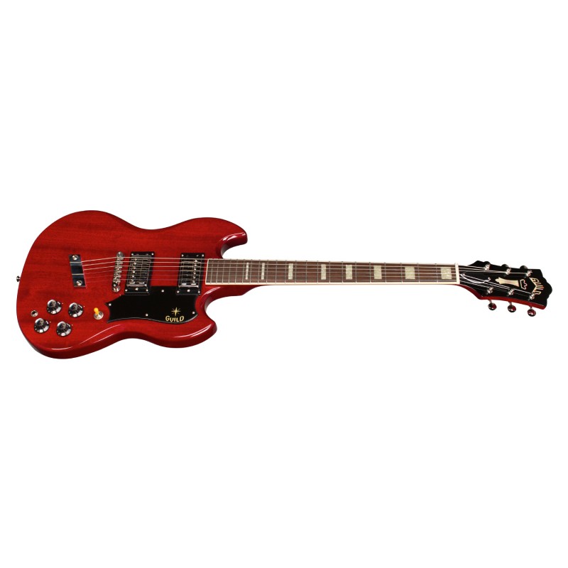 Lo stile Guild dei 70 è tornato ed è più in forma che mai con la riedizione della solid-body S-100. Con il suo corpo massello in mogano come per il manico ( profilo Soft U Shape) la tastiera in Pau Ferro con gli inlay block in madreperla e i binding in ABS avorio, il nut (Capotasto) in osso è da 43 mm e la scala di 629 mm. La nuova S-100 Polara evoca la sua progenitrice Hard-Rock di più di 40 anni fa, versatile, pronta ed essenziale con ponte tune o matic e attaccacorde nickel, meccaniche Grover con ratio 18:1. La parte elettronica dello strumento annovera un paio di pickup HB-1 evoluzione High gain della fortunata serie LB-1 creati per ottenere un suono potente, corposo adatto a diversi generi musicali. Il battipenna Guild S-100 è in celluloide, La finitura è poliuretanica lucida è Cherry Red . Il grande ritorno di un vero classico Guild.