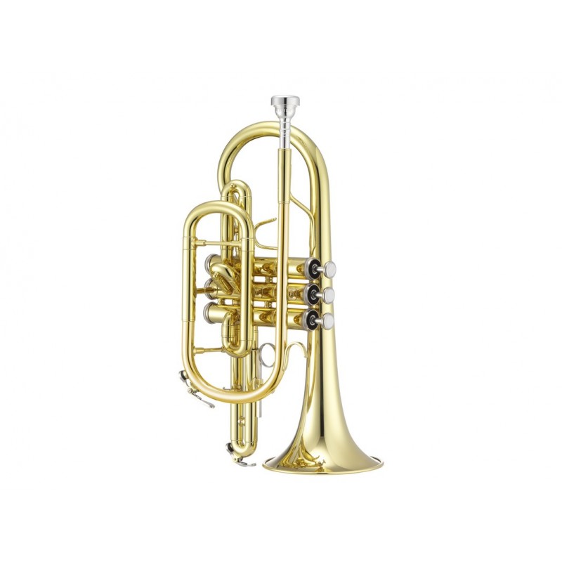 Cornetta in Sib / Intonazione: Sib / Campana: diametro 120 mm / intarsi in Pearloid sui bottoni dei pistoni / Poggiadito slide primo pistone / Astuccio / Bocchino / Panno di pulizia e accessori / Campana: Ottone,...