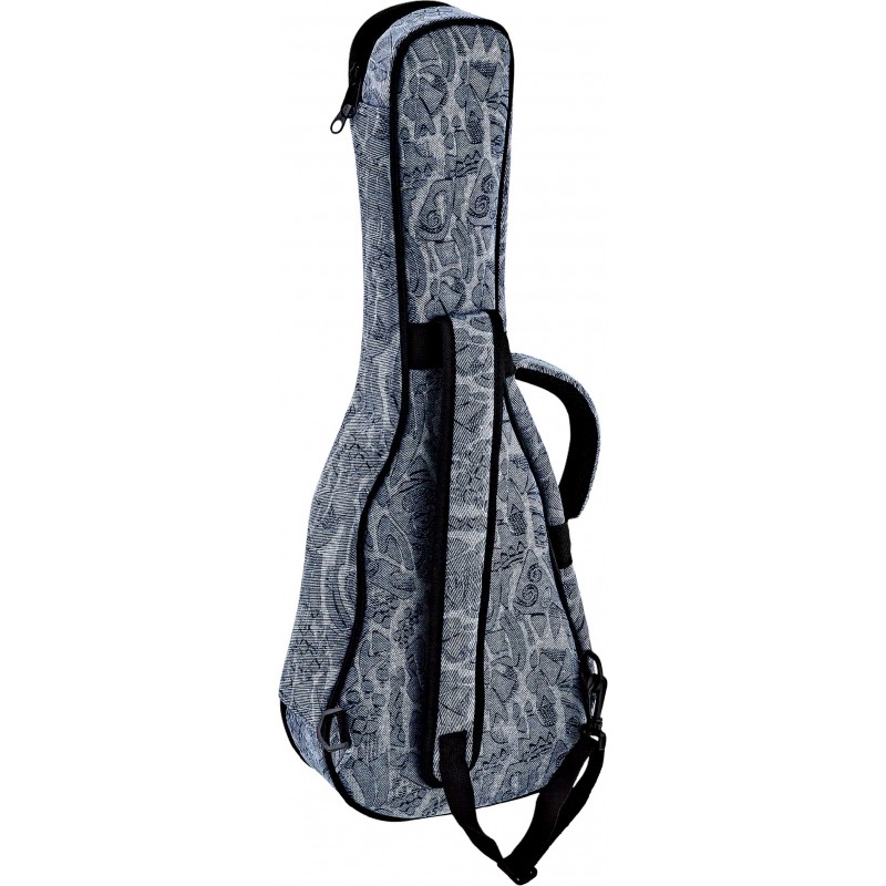 Custodia stampata per ukulele concerto con esterno in cotone stile `` jean´´ e interno in nylon. 12 mm di imbottitura. Con cinturini stile zaino. Scomparto frontale. Colore Blue Jean