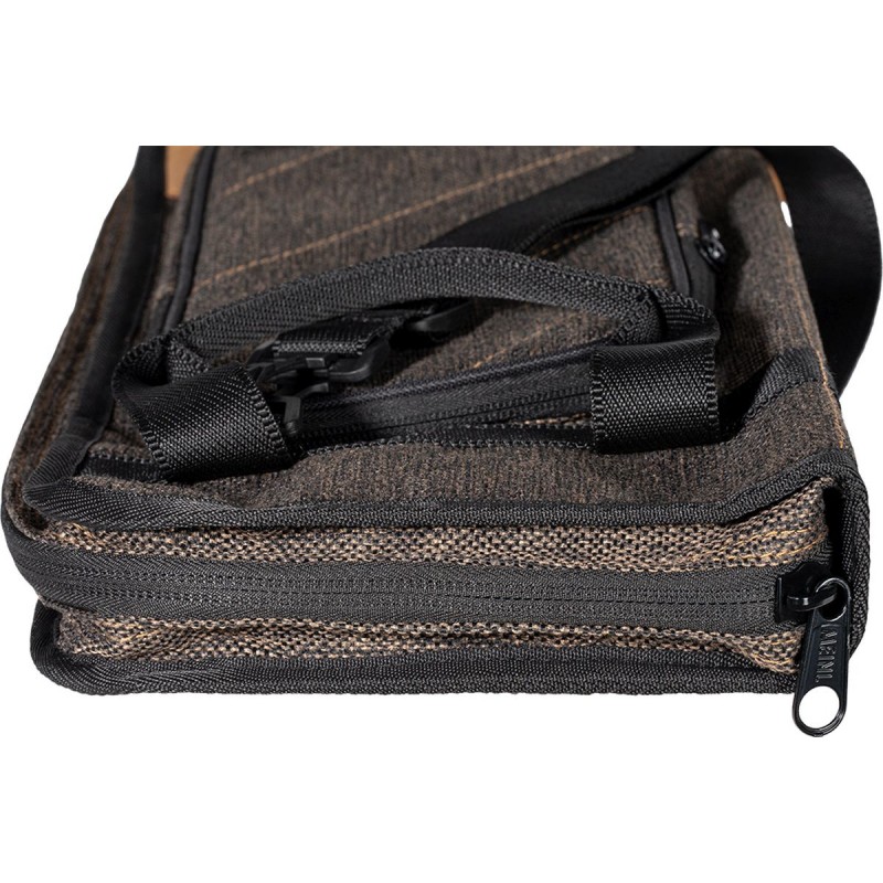 Il nostro tessuto esterno in poliestere 600D ultra resistente è rinforzato con un rivestimento in PVC per una maggiore durata. Presenta inoltre dettagli in pelle scamosciata sul fondo. All'interno dello scomparto principale ci sono cinque tasche per riporre un gran numero di bacchette, spazzole, battenti e mazze (4 grandi tasche a soffietto e 1 tasca aggiuntiva). Inoltre, ci sono quattro tasche per accessori di dimensioni più piccole per ospitare parti o effetti sonori. Questa borsa è dotata di ganci e cinghie per floor tom di lunghezza regolabile affinché rimanga in posizione aperta. Per un rapido accesso, l'ampia tasca esterna è dimensionata per accessori o strumenti comuni. Una tracolla regolabile/removibile ti permette di trasportare comodamente questa bag ai concerti o in studio.
