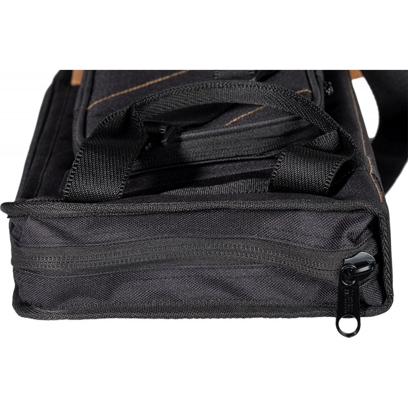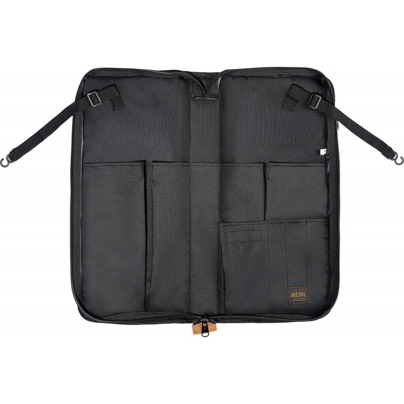 Il nostro tessuto esterno in poliestere 600D ultra resistente è rinforzato con un rivestimento in PVC per una maggiore durata. Presenta inoltre dettagli in pelle scamosciata sul fondo. All'interno dello scomparto principale ci sono cinque tasche per riporre un gran numero di bacchette, spazzole, battenti e mazze (4 grandi tasche a soffietto e 1 tasca aggiuntiva). Inoltre, ci sono quattro tasche per accessori di dimensioni più piccole per ospitare parti o effetti sonori. Questa borsa è dotata di ganci e cinghie per floor tom di lunghezza regolabile affinché rimanga in posizione aperta. Per un rapido accesso, l'ampia tasca esterna è dimensionata per accessori o strumenti comuni. Una tracolla regolabile/removibile ti permette di trasportare comodamente questa bag ai concerti o in studio.