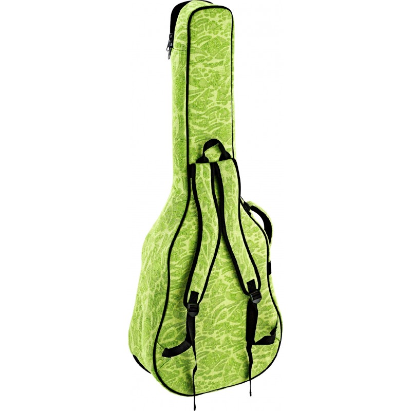OGBAC-DN-GRJ Borsa stampata per chitarra acustica con esterno in cotone stile jeans e interno in nylon. Imbottitura 12 mm. Con cinghie stile zaino. Scomparto anteriore. Colore Green Jean