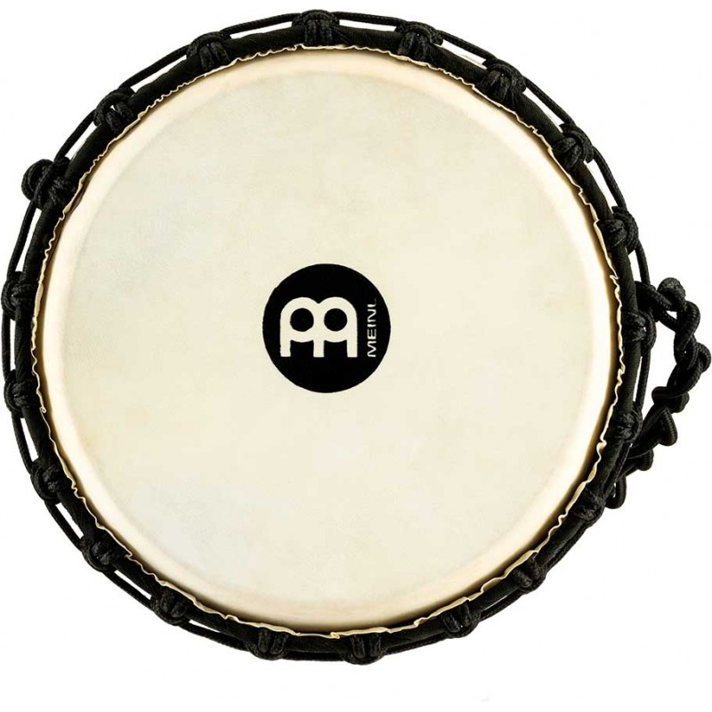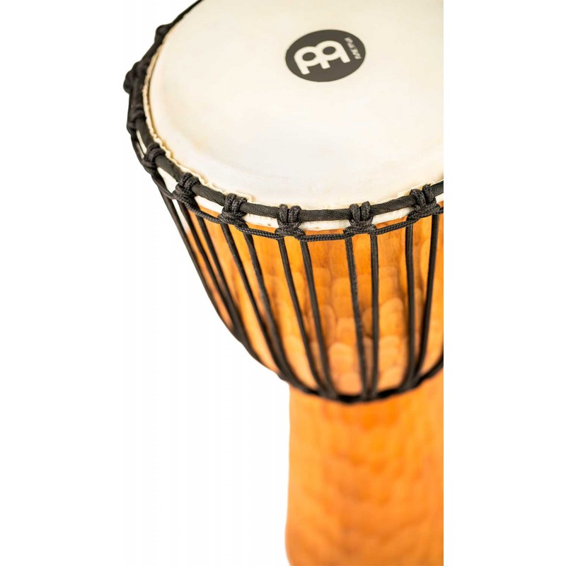 'Djembe in legno da 12''''. Questi Djembes sono ricavati da un solido pezzo di legno di mogano coltivato in piantagione, e sono intagliati a mano con un motivo di increspatura orizzontale che suggerisce un fiume che...