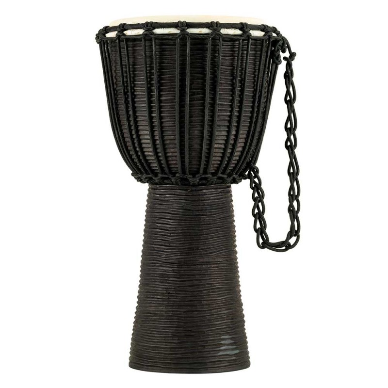 'Djembe di legno da 10''''. Questi Djembes sono ricavati da un solido pezzo di legno di mogano coltivato in piantagione, e sono intagliati a mano con un motivo di increspatura orizzontale che suggerisce un fiume che...