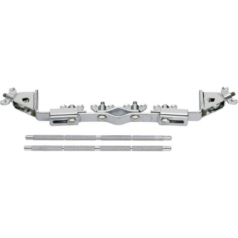 'Raccordo MC-2. Questo raccordo permette di aggiungere due piccoli elementi di percussione a qualsiasi piede di piatto/percussione. Regolabile in altezza. Caratteristiche principali:Finitura cromataBarre diritte