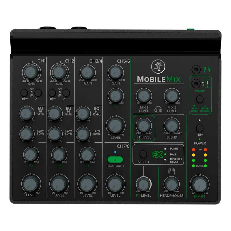 MobileMix mette insieme la leggendaria qualità integrata e l'eccellente sound che rendono Mackie un prodotto affidabile in tutto il mondo. Si comincia con due canali di preamplificazione microfonica completi di connettori combo XLR e 1/4', interruttori di impedenza Hi-Z per chitarre elettriche e altri strumenti passivi, filtri low-cut e alimentazione phantom a 48 V per microfoni a condensatore.
