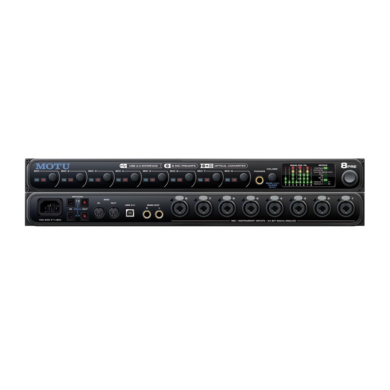 Interfaccia audio a 24 bit e 96 kHz. Disponiamo di 8 preamplificatori microfonici o strumentali con alimentazione phantom a 48 V e connettori combo XLR/jack, 8 canali ADAT ottici digitali I/O. Porta MIDI inout....
