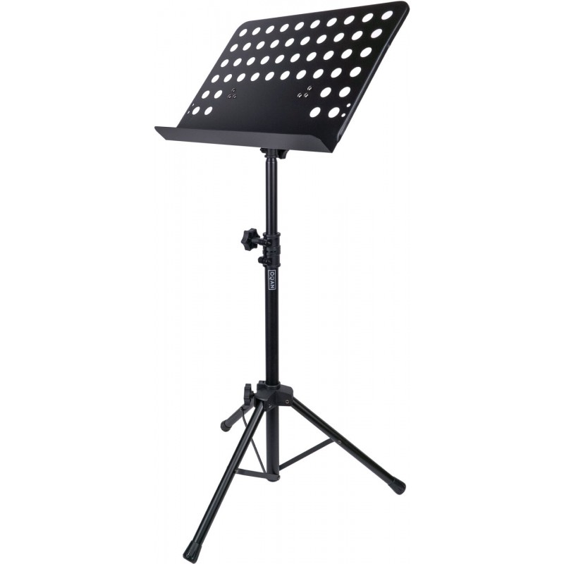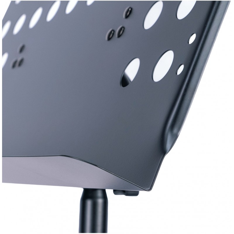 Leggio da palco in metallo per spartiti. Finitura nera. Altezza regolabile tra 94 e 142 cm. Dimensioni del vassoio: 475x345 mm. Peso 3 kg.