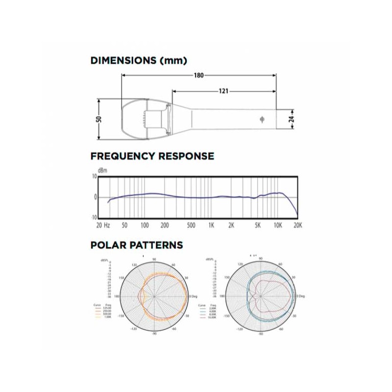 Polarity: Positive pressure on diaphragm produces positive voltage on pin 2 relative to pin 3 of output XLR connector