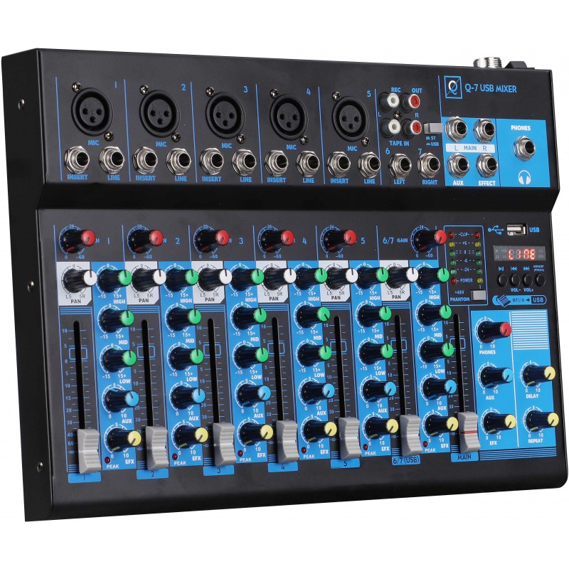 Mixer 7 canali con USB/Bluetooth MP3 player. (5 canali mono + 1 stereo). 5 input microfonici XLR. 2 input line. Preamplificatori microfonici di alta qualità. Controllo gain e pan per ogni canale. Equalizzazione attiva...