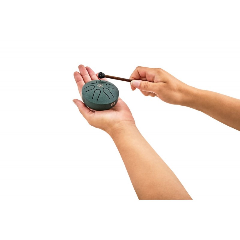 'Pocket Steel Tongue Drum MEINL Sonic Energy da 3, in La maggiore, 6 note, 440 Hz, verde scuro, germe di vita. Lo Steel Tongue Drum in acciaio tascabile Meinl Sonic Energy ideale per qualsiasi amante della musica,...