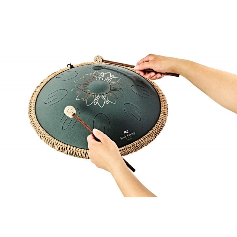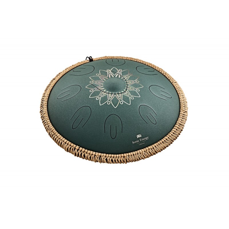 'Steel Tongue Drum in acciaio MEINL Sonic Energy da 16, ottavato, in fa diesis minore, 9 note, 432 Hz, verde scuro, disegno floreale inciso. Lo Steel Tongue Drum in acciaio Meinl Sonic Energy Octave realizzato in acciaio inossidabile di alta qualit. Ha una nota grave centrale e otto note aggiuntive attorno ad essa. Ciascuna di queste otto note composta da due lamelle che emettono il suono in due ottave. Questo crea un suono meraviglioso e meditativo, simile a quello di un handpan. Nella parte inferiore del tamburo si trova la bocca, che pu essere chiusa con un tappo in silicone per rendere il suono ancora pi compatto. Dispone inoltre di tre piedini in silicone nella parte inferiore per evitare che il tamburo scivoli. possibile suonare il Steel Tongue Drum in acciaio Octave con le bacchette o con le dita. Basta posizionarlo su una superficie piana o sulle ginocchia per iniziare a suonare.