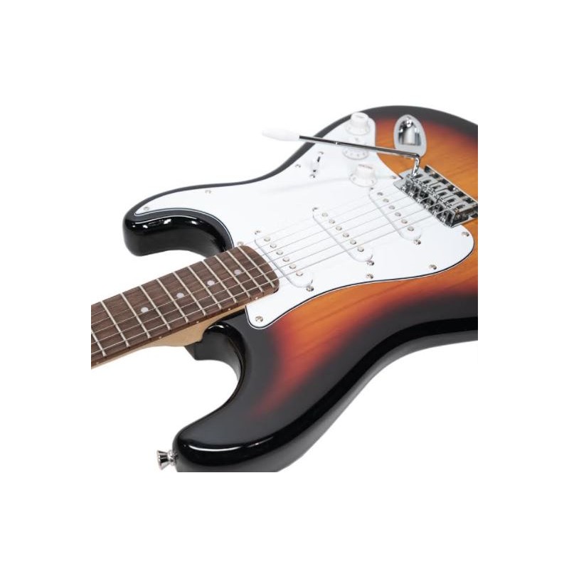 Pack chitarra elettrica. Composto da chitarra elettrica tipo Strato e amplificatore 10w. Chitarra con corpo in tiglio. Tastiera in 'compound rosewood' 22 tasti. Tastiera in acero. 3 pickup semplici. Selettore pickup 5...