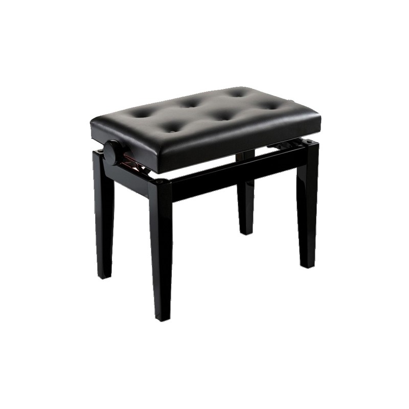 Panca per pianoforte in legno regolabile in altezza. Seduta rivestita in materiale sintetico nero. Finitura satinata.