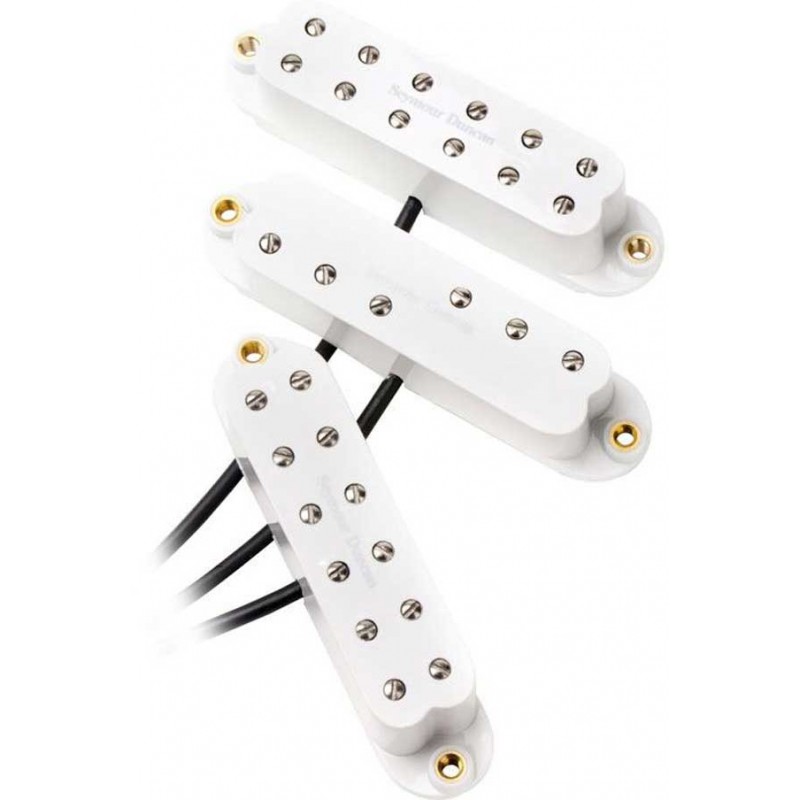 11208-15-W Ultra versatile single coil sized humbucker set for Strat, consisting of a JB Jr. bridge, Duckbucker middle, and Little 59 neck. This 3 pickup set will give your Strat into the ultimate versatile workhorse guitar with its wide variety of tonal options. The JB Jr. bridge model will take your Strats bridge position to a whole new level. This high output single coil sized humbucker will give you nice crunchy chords, and screaming lead tone with that classic upper midrange cut. There will be tons of bright harmonic sparkle, and a tight focused low end. The middle position Duckbucker there to add that sparkly single coil tone in positions 2, 3, & 4. Its unique, split-pole pattern with 3 poles on each coil, also contributes to the single coil bounciness and snappy low end. The Little 59 in the neck position has a nice, balanced P.A.F.-like response for big, full chords, and fat, punchy solos. It has that pleasing blend of warmth and bite when you dig in. Hand built in Santa Barbara, CA, these pickups all use a ceramic bar magnet, come with a 4-conductor lead wire for multiple wiring options, and are wax potted for squeal free operation.