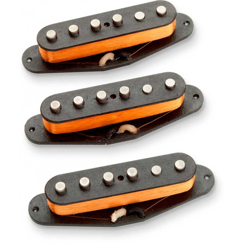 11204-01-Cset This set of Stratocaster pickups delivers all the chime and bell tone enjoyed by Strat players in the 50s, but with a sweeter sounding treble attack. The Alnico 2 Pro Staggered single coil Stratocaster pickups use hand ground alnico 2 rod magnets with a traditional staggered pattern, and heavy Formvar mag wire with a special wind pattern to produce that classic bouncy tone you’d expect from the best 50s Strat pickups. The treble attack is soft and sweet, the mids feel just slightly scooped, while the low end has a vintage sponginess. Chords have a nice smoothness and single notes have a singing, musical character. This calibrated set includes a reverse wound, reverse polarity middle pickup for noiseless operation in positions 2 & 4. Like all our vintage Fender-style single coil pickups, we start with the right color and thickness of Forbon flatwork. Along with the period correct magnet stagger, these pickups come complete with waxed and tinned cloth pushback hook-up wires and traditional keyed bottom plates. The bobbins on all the Alnico 2 Pro Staggered for Stratocaster pickups feature hand-filed flatwork, are assembled and lacquered just as it was done during Fenders Golden Age, and are wax potted for squeal free use.