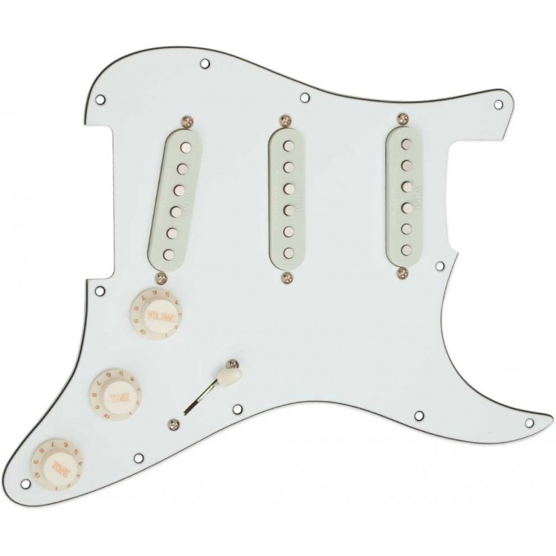 11203-33-OW-PGD This fully loaded Strat pickguard was spec’d out by Yngwie himself to ensure that with this setup your Strat will deliver The Fury. The YJM Fury Loaded strat pickguard is ready to drop-in to your Stratocaster with an 11 screw-hole USA pattern. This prewired setup includes a calibrated set of the YJM Fury signature pickups, and the high-speed no-lube YJM volume potentiometer that meets Yngwie’s demands for speed and responsiveness. These handmade pickups are built and loaded into the pickguards in Santa Barbara, CA. The bridge model is designed to handle Yngwie’s chordal onslaught, and it delivers a precise, articulate response that has just the right amount of high end without sounding harsh or brittle. The bridge model is wound hotter to provide better balance with the neck & middle pickups. The neck and middle model is designed to bring out the balance of Yngwie’s fluid left-hand technique with his broad mix of right-hand pick attack for a tone that is sweet and smooth. There is just the right amount of high end to make this pickup extremely articulate, and especially responsive to dynamics. Back in the 80s we patented a special bottom coil that actually injects negative hum into the pickup circuit and at the end of the production process, and we fine tune each pickup for maximum noise cancelation. You get all of the great qualities a classic Strat pickup, and none of the hum with our Stack pickups.