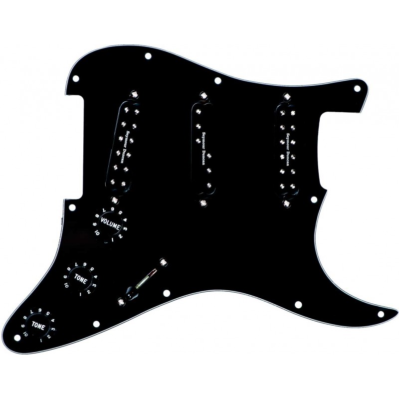 11550-03-B The Everything Axe set for Strat and Liberator system, pre-loaded into either a white or black, three-ply pickguard that will add a ton of versatility to your guitar. This 3 pickup set will turn your Strat into the ultimate versatile workhorse guitar with its wide variety of tonal options. The JB Jr. bridge model will take your Strats bridge position to a whole new level. This high output single coil sized humbucker will give you nice crunchy chords, and screaming lead tone with that classic upper midrange cut. There will be tons of bright harmonic sparkle, and a tight focused low end. The middle position Duckbucker there to add that sparkly single coil tone in positions 2, 3, & 4. Its unique, split-pole pattern with 3 poles on each coil also contributes to the single coil bounciness and snappy low end. The Little 59 in the neck position has a nice, balanced P.A.F.-like response for big, full chords, and fat, punchy solos. Has that pleasing blend of warmth and bite when you dig in. Any future pickup changes you decide to make will be a snap becuase this pickguard comes equipped with a Liberator solderless system that makes swapping pickups fast and easy. Hand built in Santa Barbara, CA, these pickups come with a 4-conductor lead wire, and are wax potted for squeal free operation. The pots, selector switch, and cap, are all high quality, and we use vintage style cloth push back wire for all of the connections. Available with either a black or white 3-ply pickguard that features an 11-screw hole USA pattern.