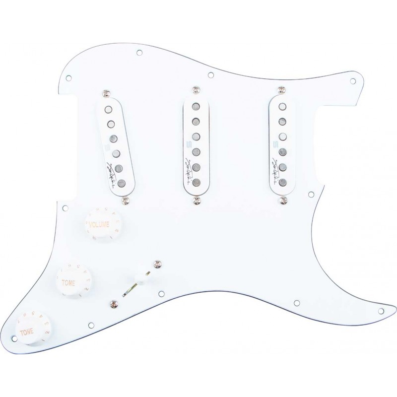 11550-08 In 1968 Jimi Hendrix played a Strat loaded with pickups hand-wound by Seymour. Fifty years later we are proud to share a piece of that history with you. On March 28, 1968, Jimi Hendrix asked a young Seymour W. Duncan to walk his guitar up onstage at his show at Xavier University in Cincinnati, Ohio. That Strat was loaded with pickups Seymour had wound just for Jimi, and that unforgettable night would set in motion Seymour’s future – and his legacy almost five decades later. Now you can be a bit closer to Jimi’s world with our Jimi Hendrix Signature Loaded Stratocaster Pickguard. The Jimi Hendrix Signature Loaded Pickguard houses those pickups in a pre-loaded 3-ply white pickguard and is available with either a standard-angle bridge pickup route or a Voodoo route (reverse-angle bridge route). Like Jimi’s music, the Jimi Hendrix Signature Strat Set pickups have their roots in the traditional but with an eye on the future. Each is custom wound for a richer, melodic tone. The bridge model has an aggressive attack that cuts through while staying true to his iconic lead tone. The neck pickup sounds thick and full and is great for chord work, bluesy melodies, double-stops and Jimi’s signature hybrid chord/melody style. And in the in-between positions, there’s plenty of that classic Strat ‘quack.’ To help you to get even closer to Jimi’s earth-shattering tone, each pickup is made with a reverse magnet stagger to capture the effect of playing a right-handed guitar upside-down and restrung for a lefty. The Jimi Hendrix Signature Loaded Pickguard comes packed with a little bit showcase Jimi’s signature. Please note that the Voodoo style will only fit guitars with either a swimming pool or humbucker route.The Jimi Hendrix Signature Loaded Stratocaster Pickguard is fully authorized by Authentic Hendrix LLC.