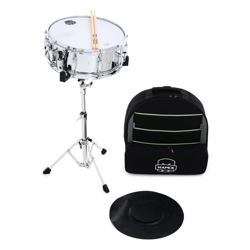 Kit Rullante da studio con pad pratica, bacchette e backpack.Rullante in acciaio 14x5 pollici finitura cromataPad pratica cappello del prete 14 polliciBacchette Innovative Percussion IP/HBBackpack Mapex per il trasporto.