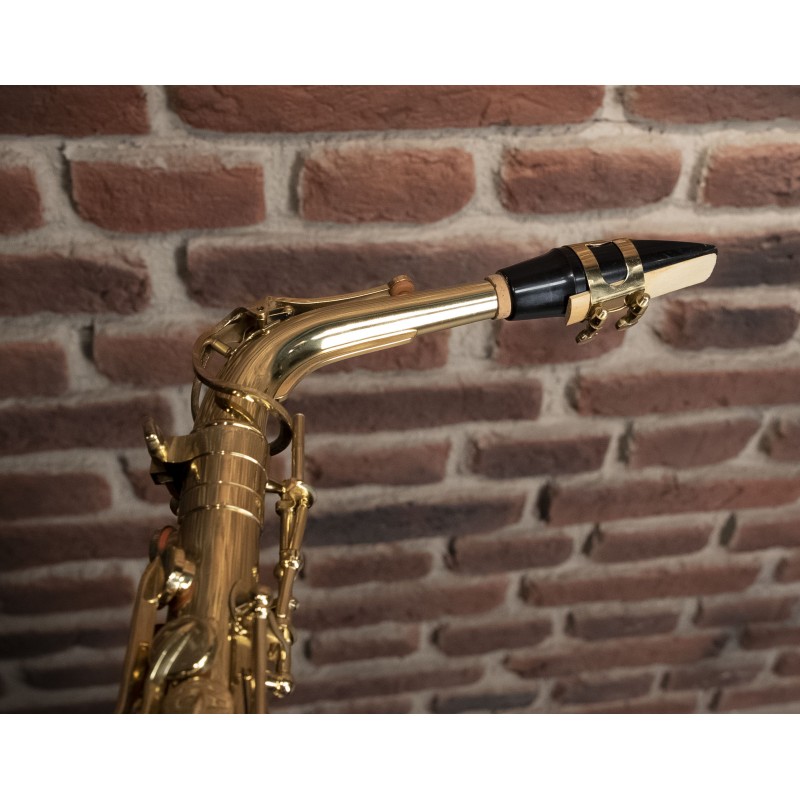 Sax Alto in Mib. Corpo e chiavi: ottone dorato. Molle: acciaio indurito. Chiave di Fa# acuto. Mecanismo articolato Do# - Sib. Pads: cuoio con risonatori di metallo. Finitura: laccata. Includes: bocchino, straccio per...