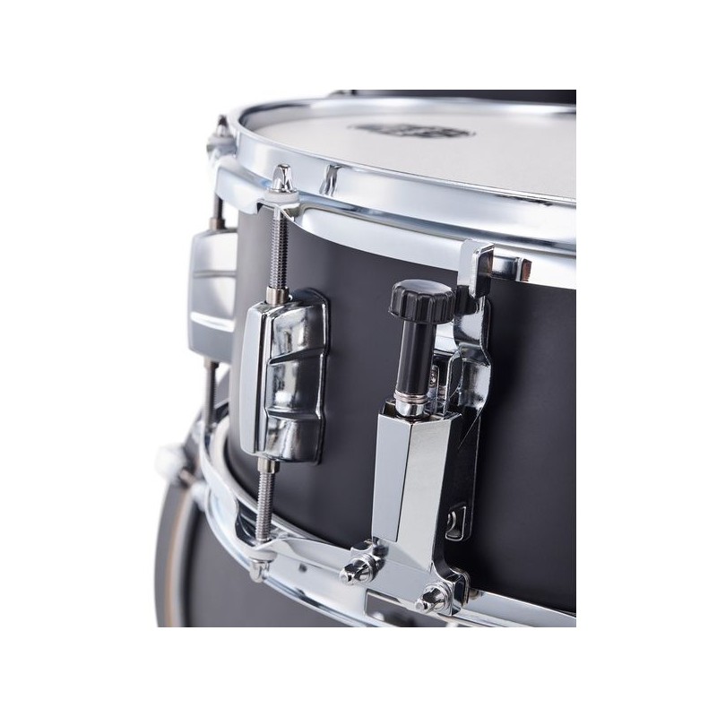 Batteria 4 pezzi finitura Matte Black KDCassa 18x14Tom 10x7Floor Tom 14x12Rullante in finitura SD1450 14x5Fusti in Acero Europeo 7 strati 7,2mmCerchi 2.3 mm Power HoopsHardware: Reggitom TH676Bordi arrotondati con s