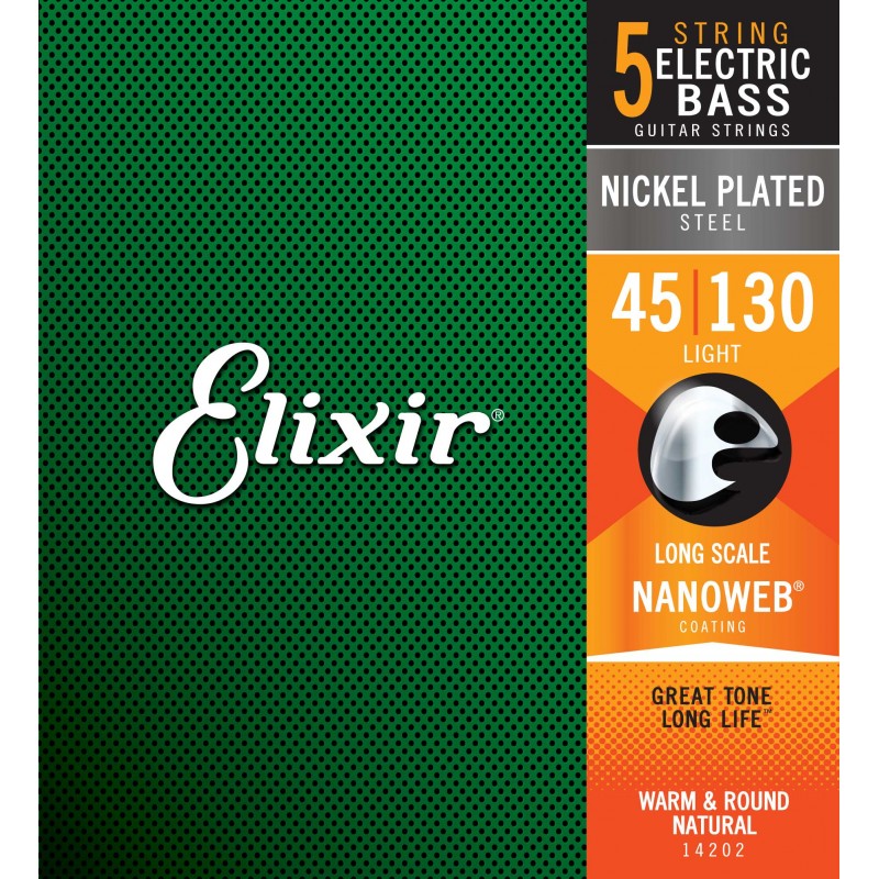 Corde per basso elettrico 5-corde con avvolgimento a sezione rotonda in acciaio nickelato. Utilizzate per un suono pieno e rotondo, con incredibile pulizia e presenza mid-range. Rivestimento NANOWEB™, appositamente studiato per il basso, offre un feeling naturale e morbido, oltre ad incrementare il grip. La nostra tecnologia di rivestimento protegge dalla corrosione e dall'accumulo di sporcizia, prolungando la qualità sonora più di ogni altra corda, coated o uncoated, sul mercato. (Elixir Strings player survey). Il rivestimento riduce anche lo scricchiolio delle corde. Scala Lunga, Scalatura Light 5-corde: .045 .065 .085 .105 .130