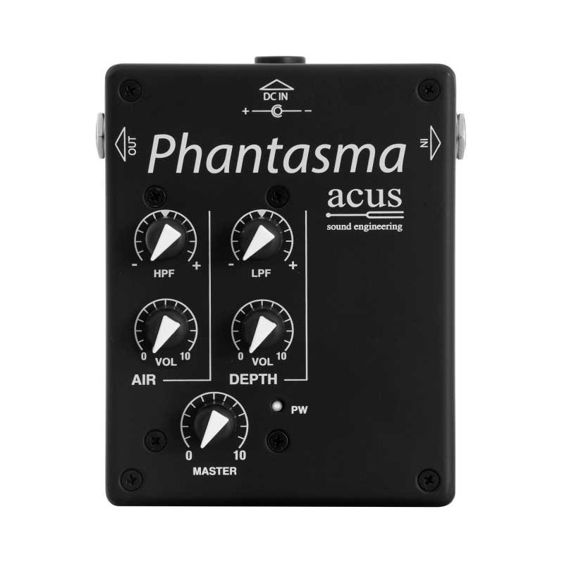 Sistema di preamplificazione per chitarra acustica o classica.Preamp esterno in classe A con Volume Master, High Pass Filter, Low Pass Filter, Depth per il controllo del piezo e Air per il controllo del microfono