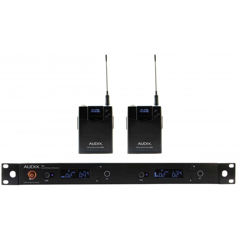 Sistema AP62 composto da un ricevitore e da due body pack H60 adatti a collegare microfoni o strumenti, per i quali è necessario il cavo per strumenti opzionale.