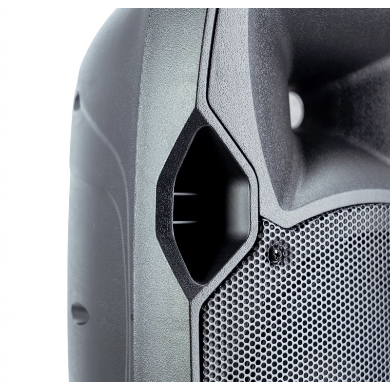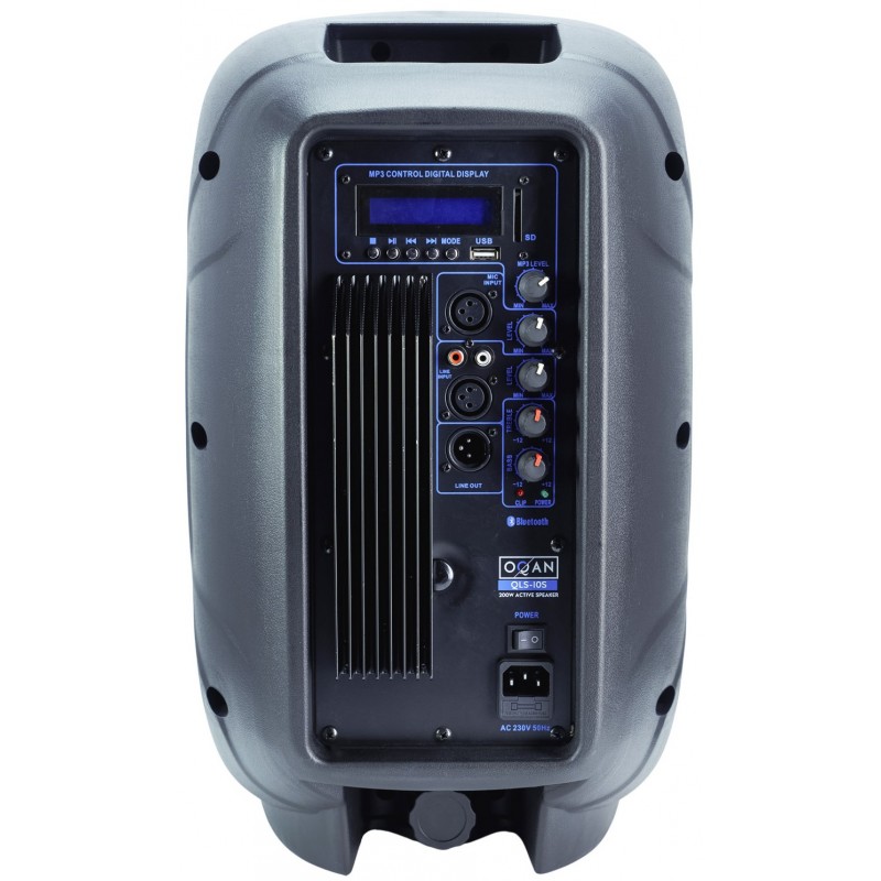 Cassa attiva 10”. 300 Watt. 150 Watt Bassi Classe D. 50 Watt Alti. 2 bande di equalizzazione. Mic In. Aux in. Controllo di volume per singolo In. Bluetooth, SD, USB MP3 player. Radio FM. Telecomando ad infrarossi.