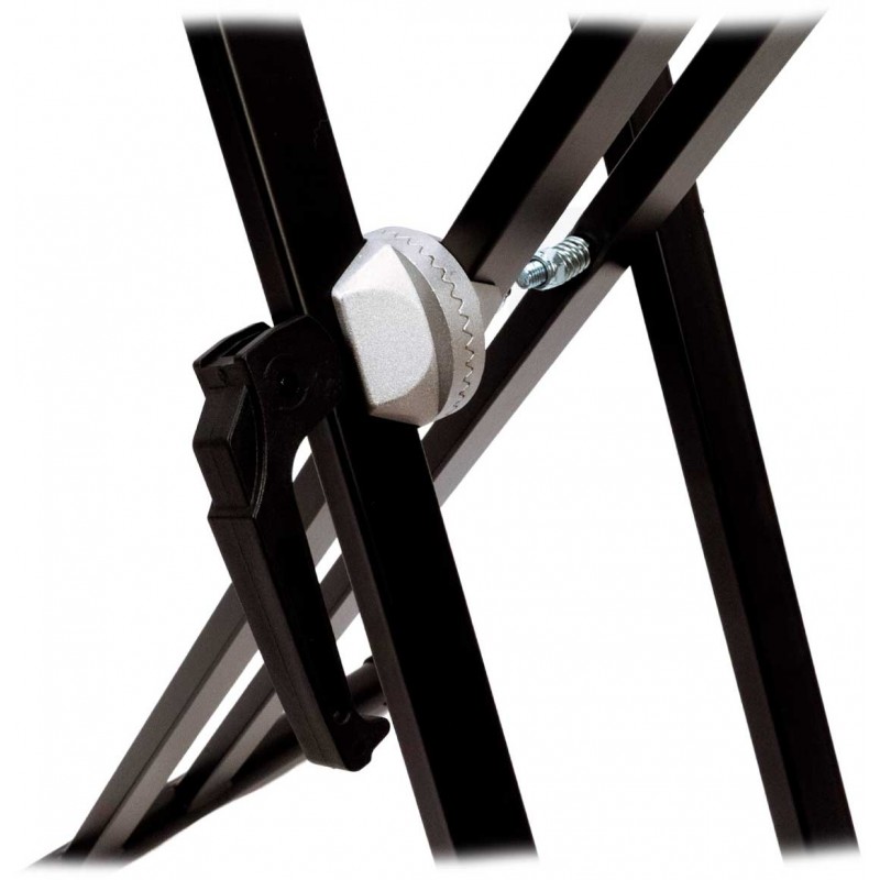 Soporte de teclado profesional de tres niveles con sistema de ajuste rápido. Patas de doble perfil y acabado en negro. Altura mínima: 560 mm. Altura máxima 970 mm. Profundidad del primer nivel 400 mm. Profundidad de...
