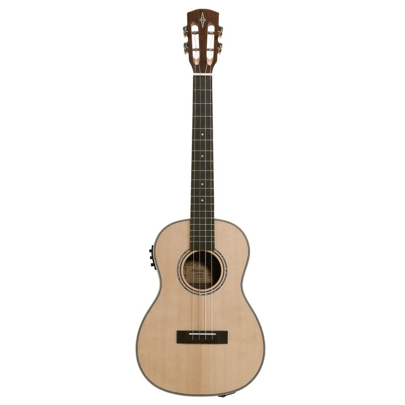 Ukulele baritono elettrificato. Tavola in abete Sitka A. Fasce e fondo in noce nero. Manico in mogano. Tastiera in palissandro. Sella e ponticello in osso vero. Ponte in palissandro. 18 tasti. Sistema di...