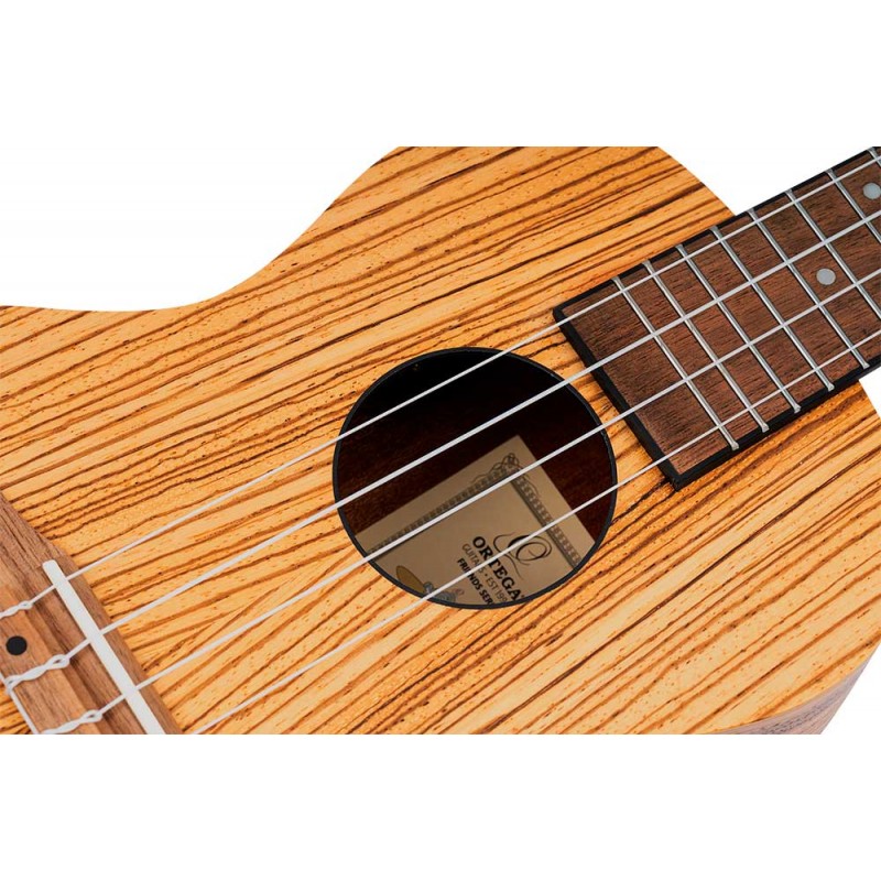 Ukulele soprano. Top, fondo e fasce di zebrawood, manico in mogano, tastiera Sonokelin. Clavijero diecast. Preamplificatore Ortega Magus Pro. Custodia deluxe inclusa.
