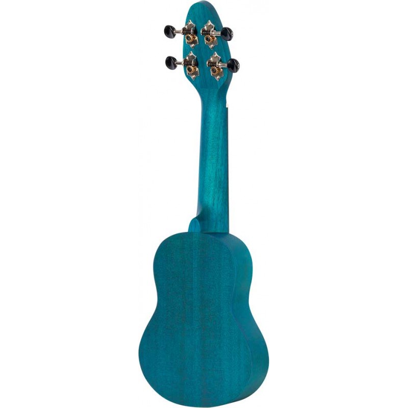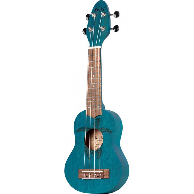 Ukulele Sopranino Keiki K1-MM per MANCINI. (più piccolo del soprano, scala 248mm). Finitura in azzurro satinato. Corpo e manico in okume, tastiera e ponte in nogal. Top in okume con incisione a laser di una tartaruga....