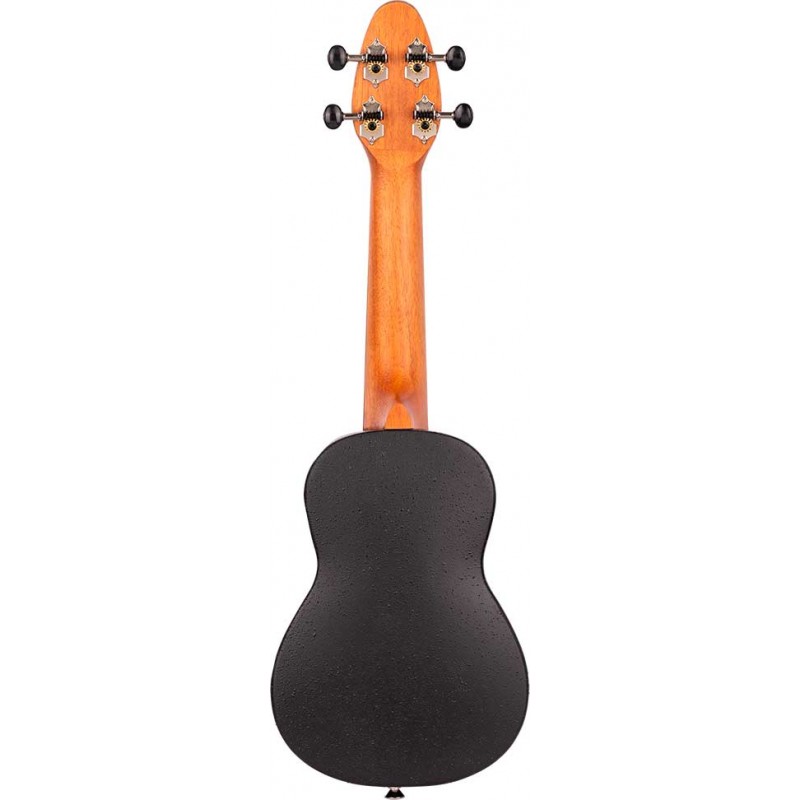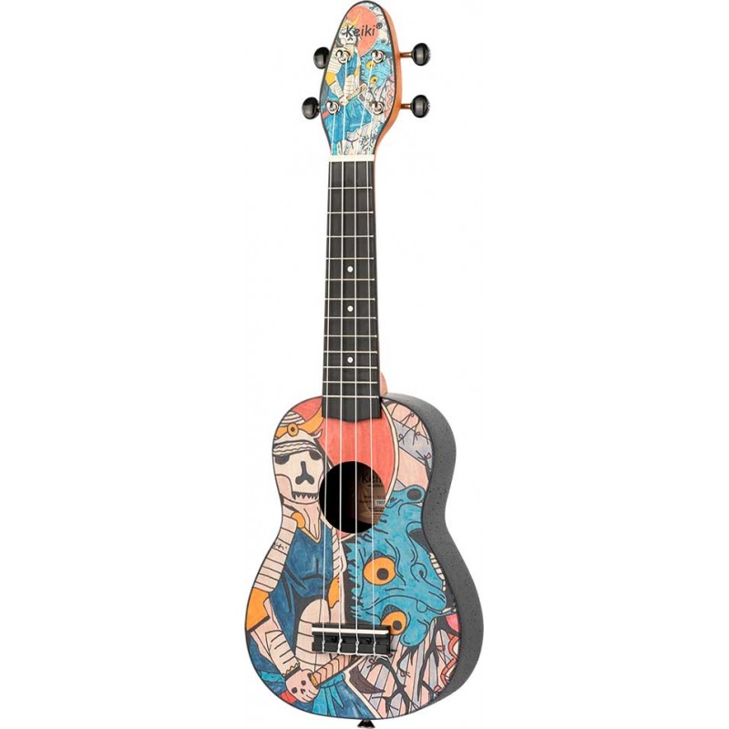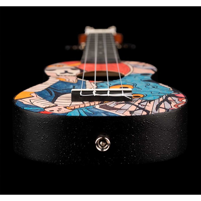 Ukulele pack soprano con disegno ``Samurai'' + accordatore + strap + plettri + borsa per il trasporto. Ukulele con ponte, tastiera e corpo arcuato in fibra. Piano in legno Agathis.