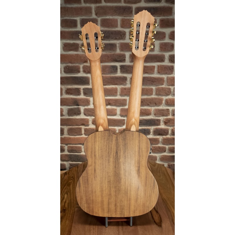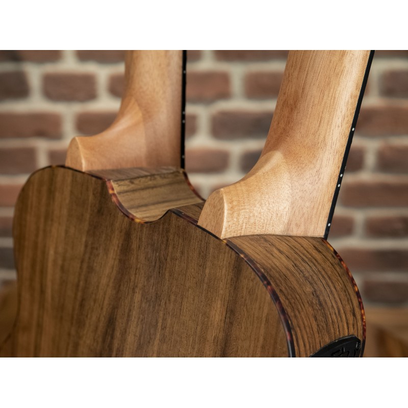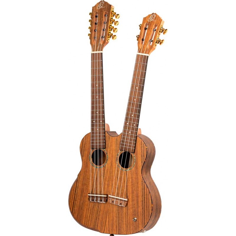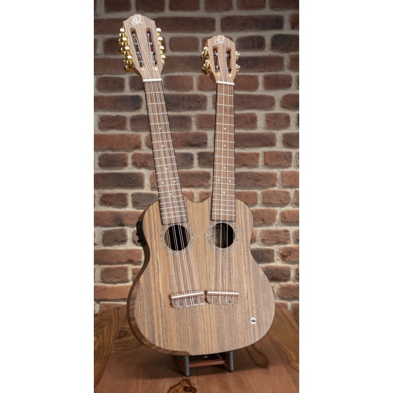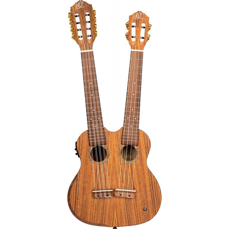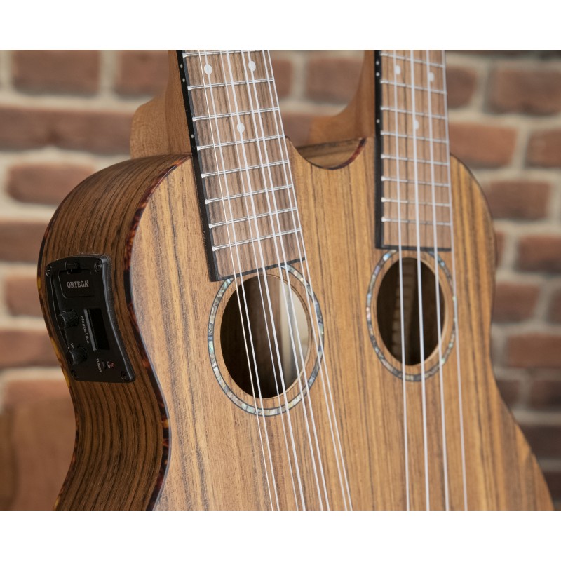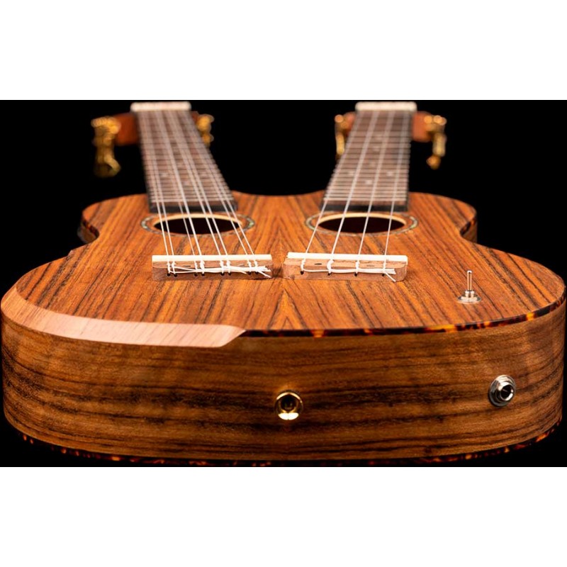 Ukulele tenore elettro acustico a doppio manico HYDRA Custom Built Series. Un manico monta 4 corde e l'altro 8. Corpo e top in ovangkol, manici in caoba, ponti, binding e battipenna in nogal. Finitura naturale a pori...