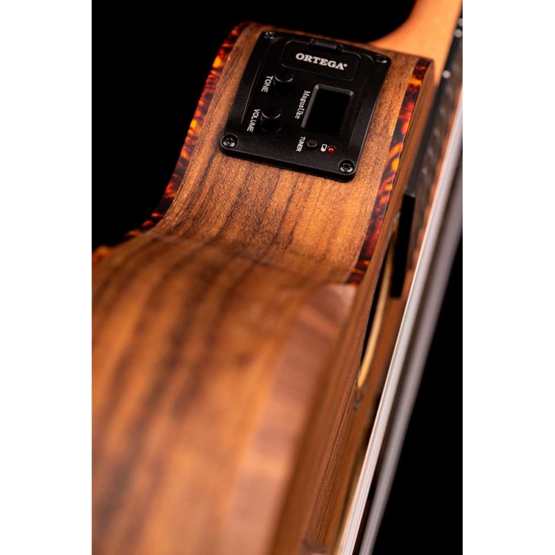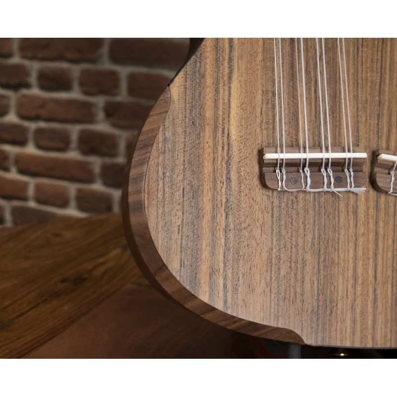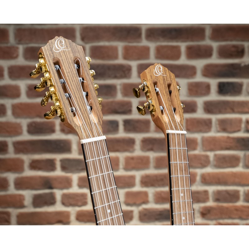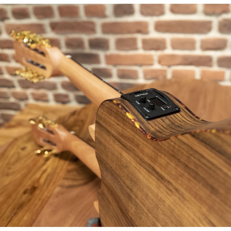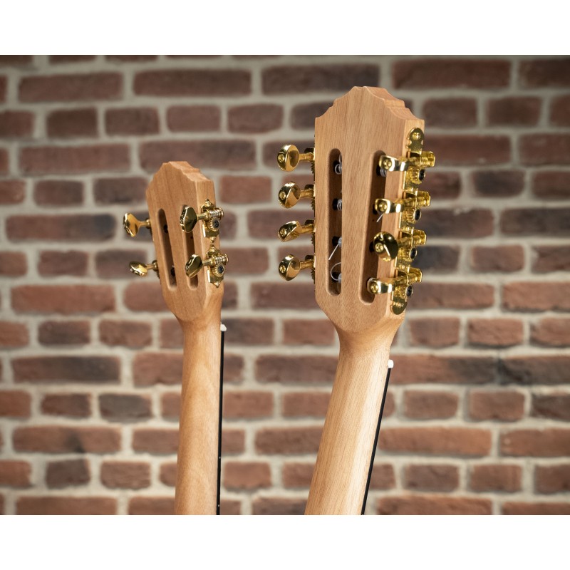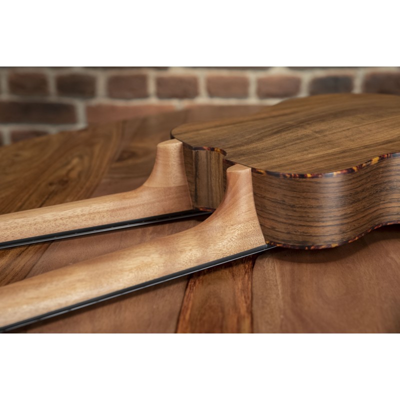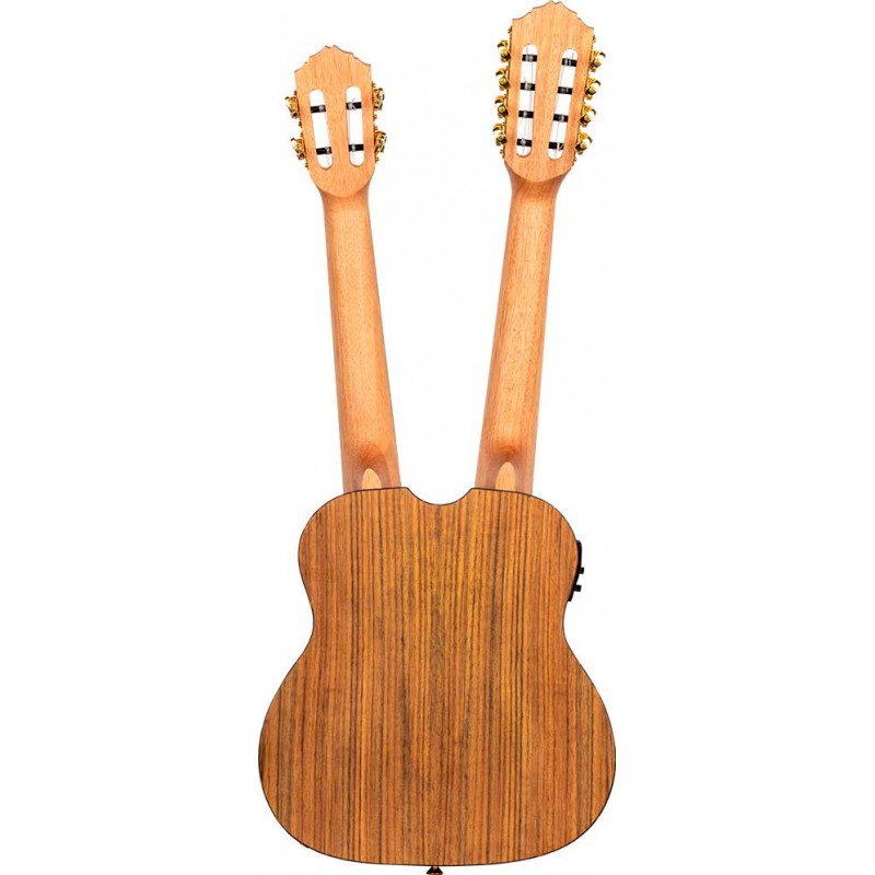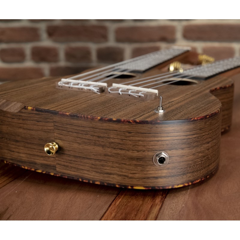 Ukulele tenore elettro acustico a doppio manico HYDRA Custom Built Series. Un manico monta 4 corde e l'altro 8. Corpo e top in ovangkol, manici in caoba, ponti, binding e battipenna in nogal. Finitura naturale a pori...