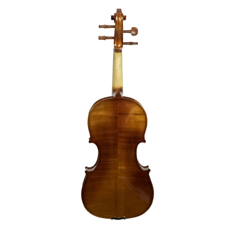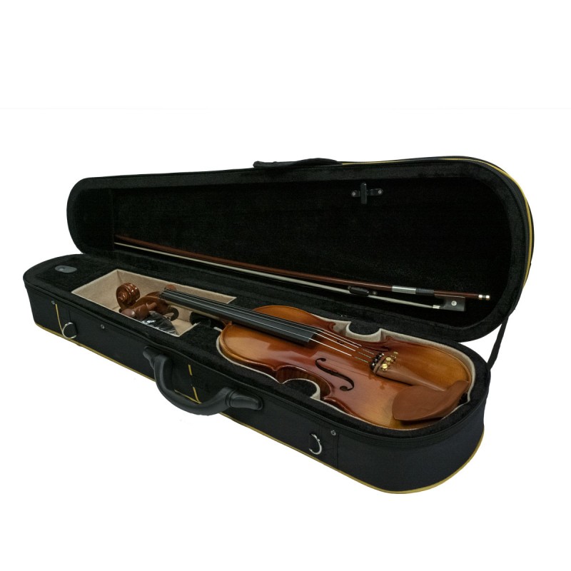 Violino modello studio con copertura in abete massello. Fondo e fasce in acero fiammato solido. Tastiera in ebano. Cordiera, martinetti e mentoniera in bosso. Ponte trattato. Corde di qualità. 4 micro accordatori....